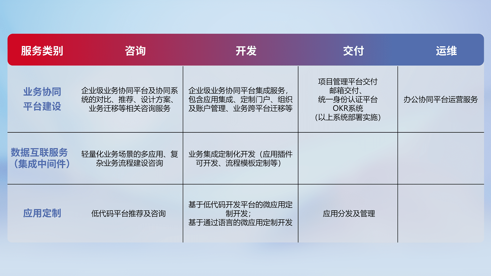 针对钉钉、、、、企微、、、IDaas等平台级产品提供产品的规划、、、、方案、、交付、、、、定制化开发等服务,,实现如统一协同办公、、智能客户服务、、混合会议管理、、智能数据查询、、等业务场景,,实现数字化转型。。。