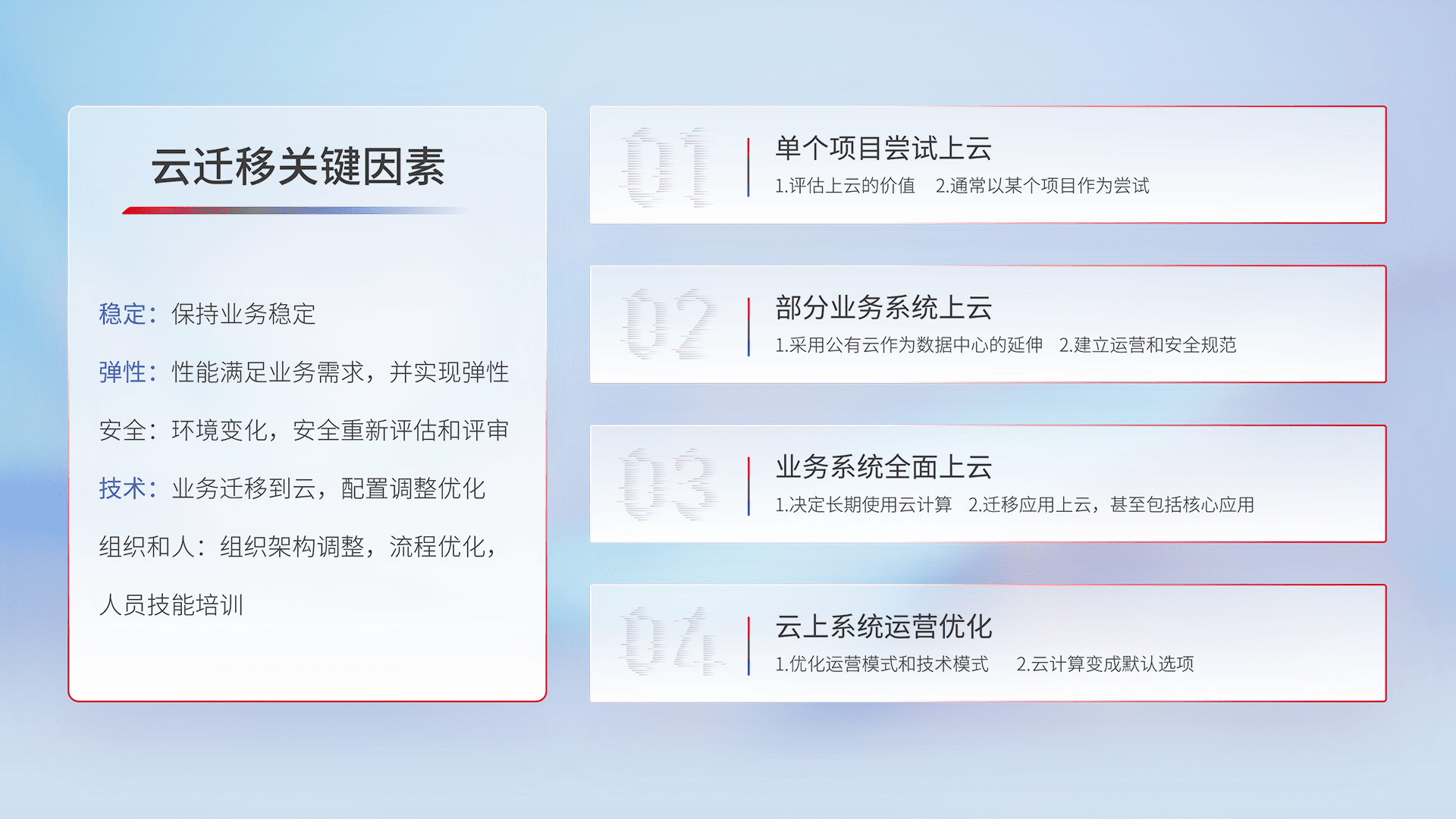 结合实际业务,,,从规划设计、、、、云平台选型、、、云原生改造、、数据迁移、、集成交付,,,迁移全过程为客户识别最佳上云路径,,,,做好风险识别管理,,设计网络架构、、、身份权限、、、安全审计合规、、、操作审计、、、、日志审计、、、监控告警策略、、、多站点容灾设计等,,对云上基础设施进行整体规划,,,提升IT治理水平,,,以满足弹性、、、高可用、、、高性能的需求。。。。