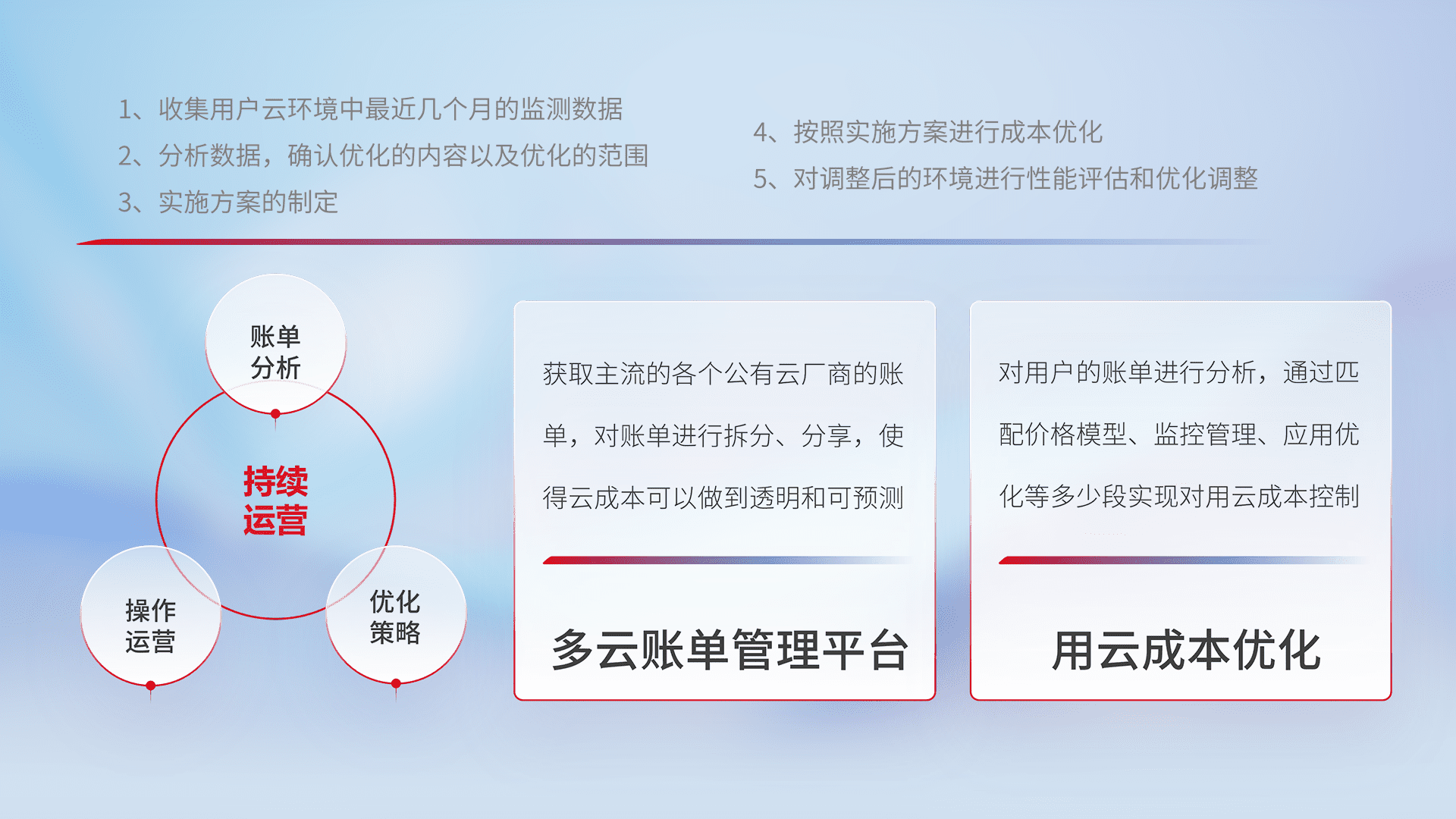 通过多云纳管,,以统一的资源数据模型把客户的云资源进行抽象和封装,,进而实现对多云资源的统一操作,,,,保障云资源管理的可靠性、、、、稳定性与可用性。。。量身定制化运维内容,,,配置、、、开发运维、、、补丁管理、、备份、、、监控、、认证和访问管理、、、审计和日常巡检等,,,,保障在用云过程中的可靠度,,,稳定度以及高可用率。。。。